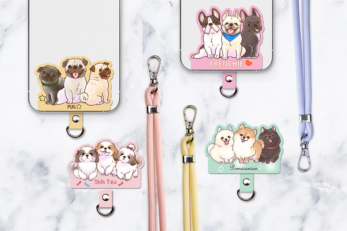 ショルダーストラップ1stシリーズはパグ、ダックス、柴犬、シーズー、トイプードル、フレブル、ポメラニアンの7犬種です。