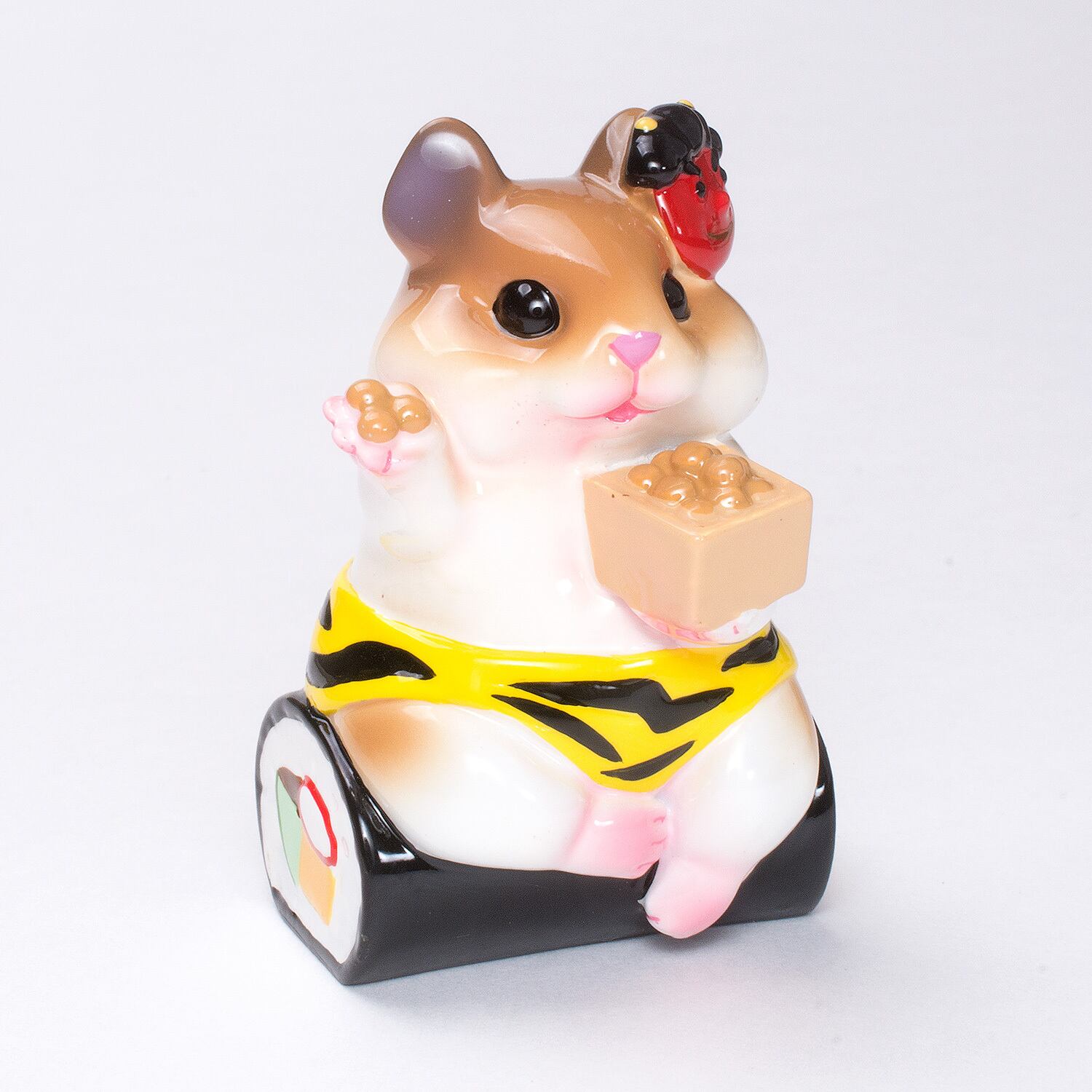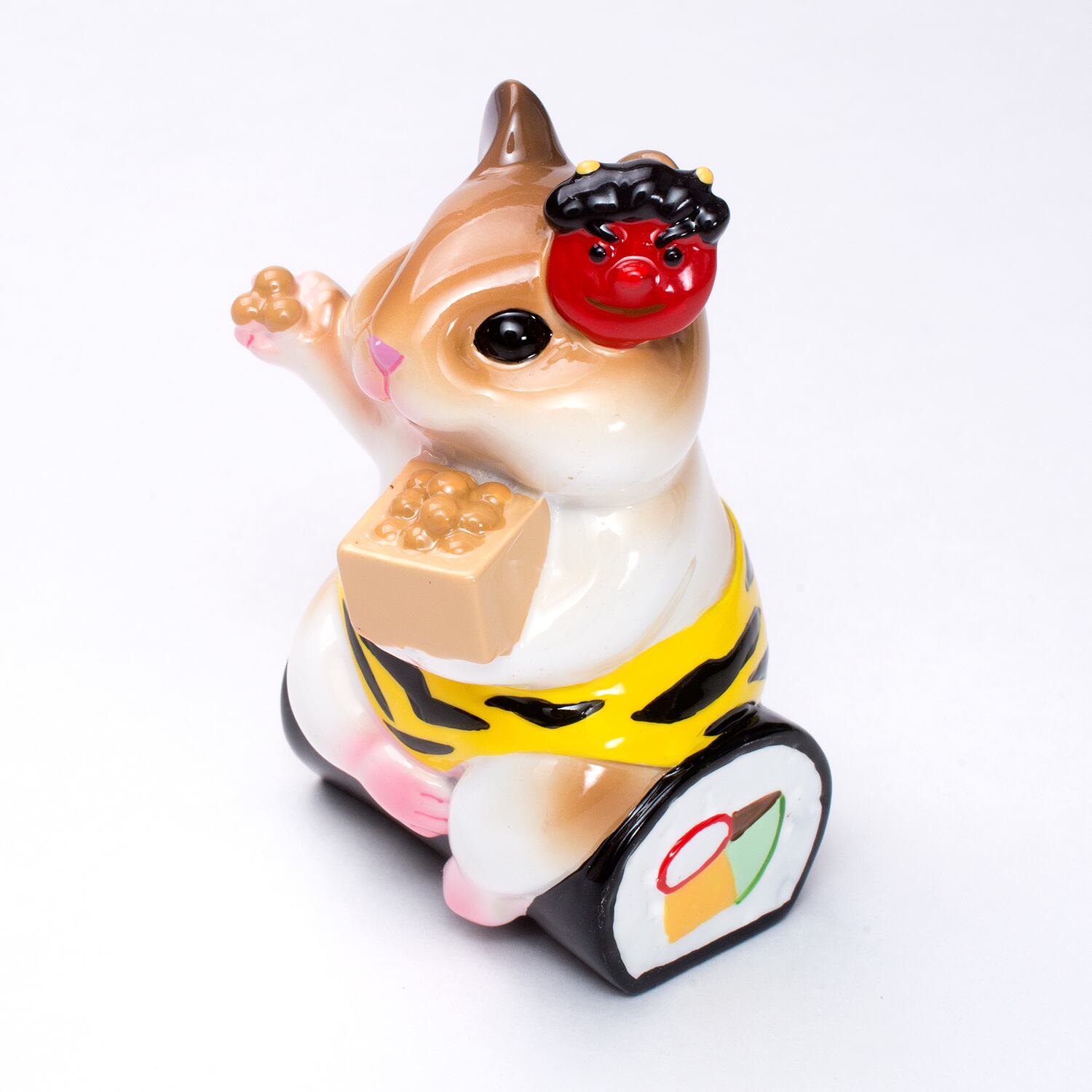 • ハムコ「季節のハムスター」シリーズ:節分ハムスター 恵方巻きに腰掛けて豆まきをするハムスター、しましま鬼パンツや鬼のお面が可愛い福を寄せる置物です。磁器アートのような仕上がりも魅力です。