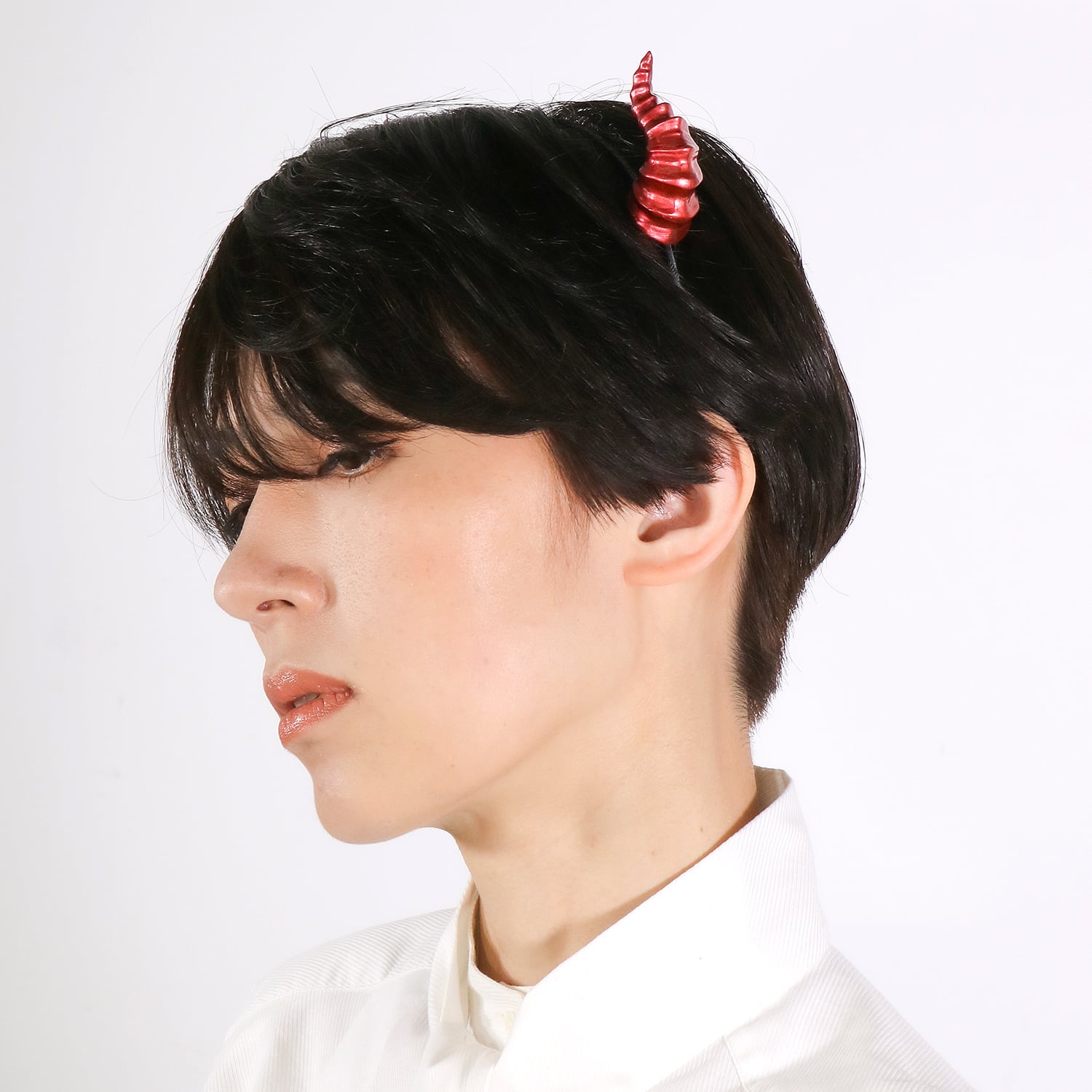 •少しキラキラが入っている赤い塗料で塗装しています。鮮やかな色なので小さいながらもしっかりとした存在感のあるツノカチューシャに仕上がりました。