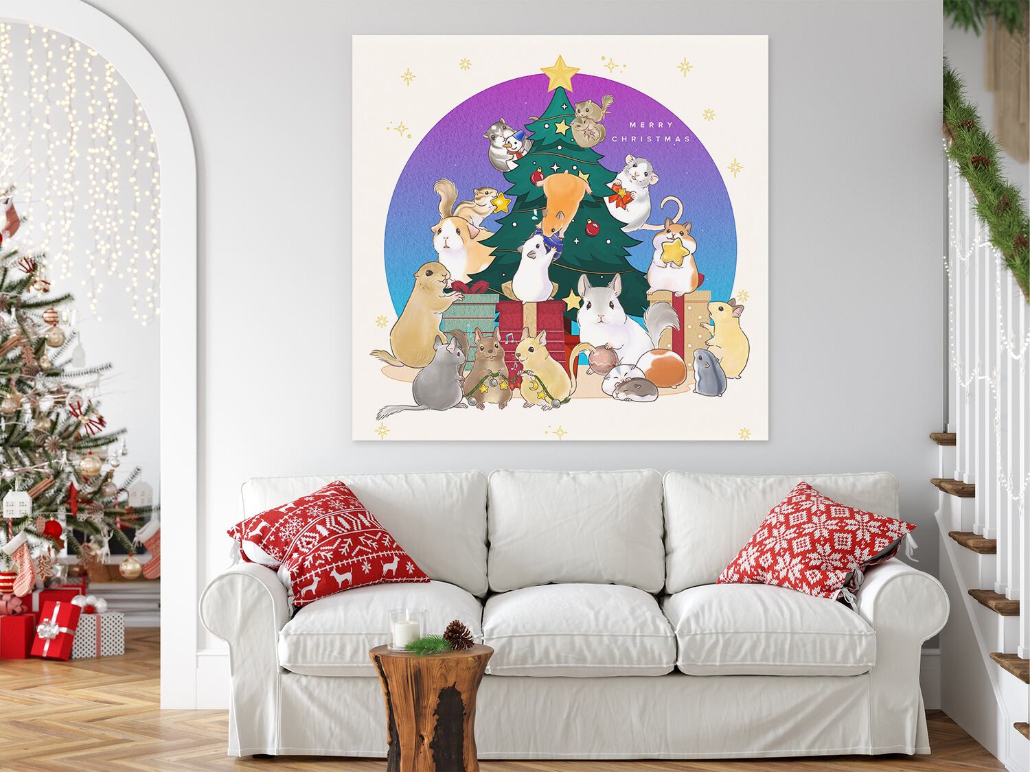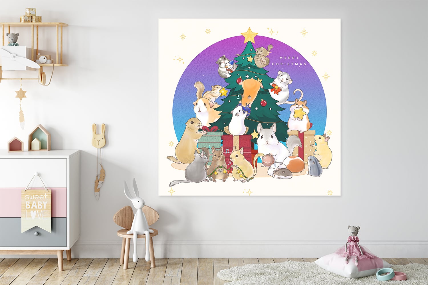 • 可愛いねずみたちがクリスマスツリーと一緒!クリスマスの大判壁飾りです。ハムスター、シマリス、スナネズミ、チンチラ、デグー、ニホンヤマネ、ファンシーラット、モルモット、リチャードソンジリスたちが楽しんでいます。