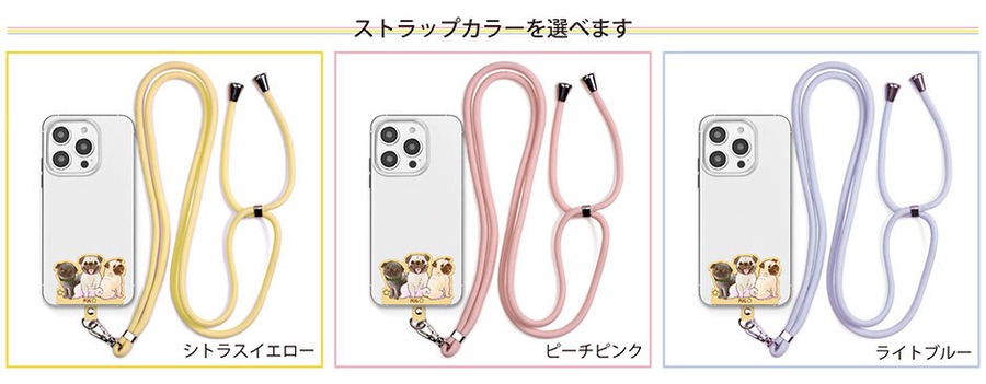 パグ 【笑顔が楽しく可愛いわんこイラスト】 スマホ ショルダーストラップ ストラップ ホルダー 各種ストラップ対応 ピーチピンク 丸紐 SE-100P